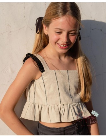 CONJUNTO DE DOS PIEZAS Top Puntilla Cáñamo + PANTALON LARGO de la marca Mi Canesú. El top Se puede abotonar delante y detrás.