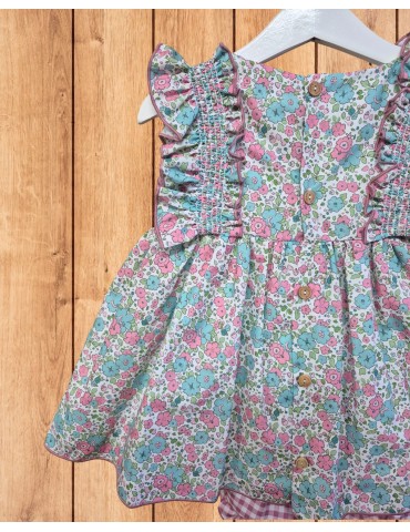 Vestido Flores Liberty y braguita de vichy engomada a juego con el lazo.